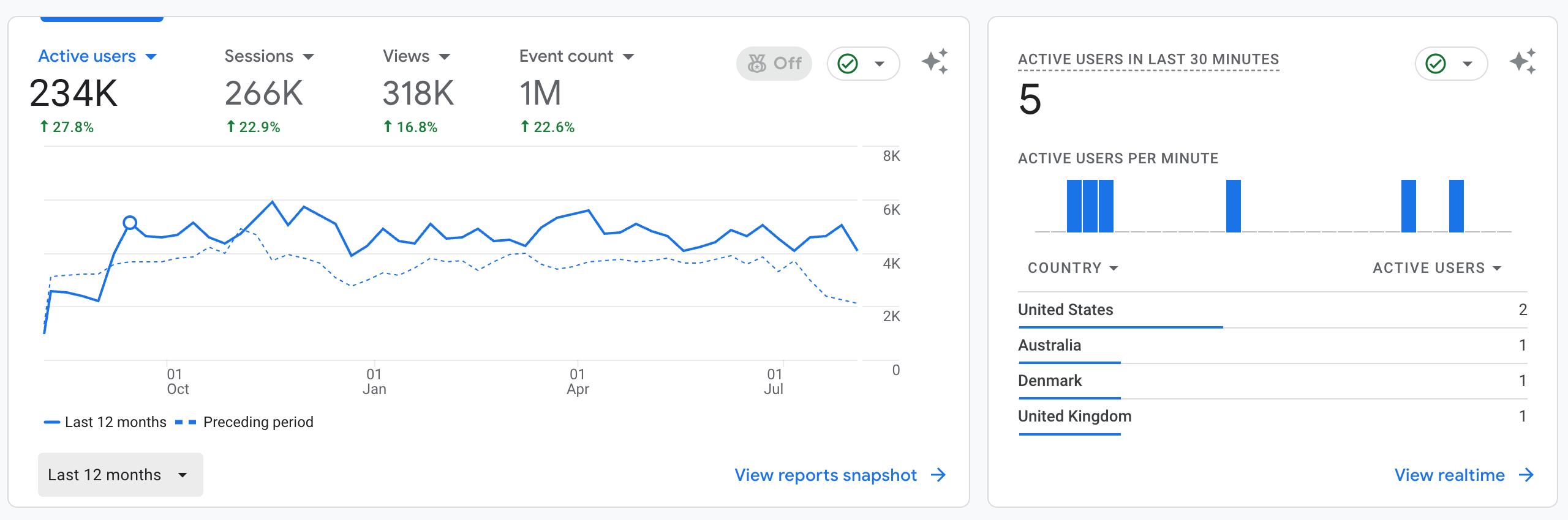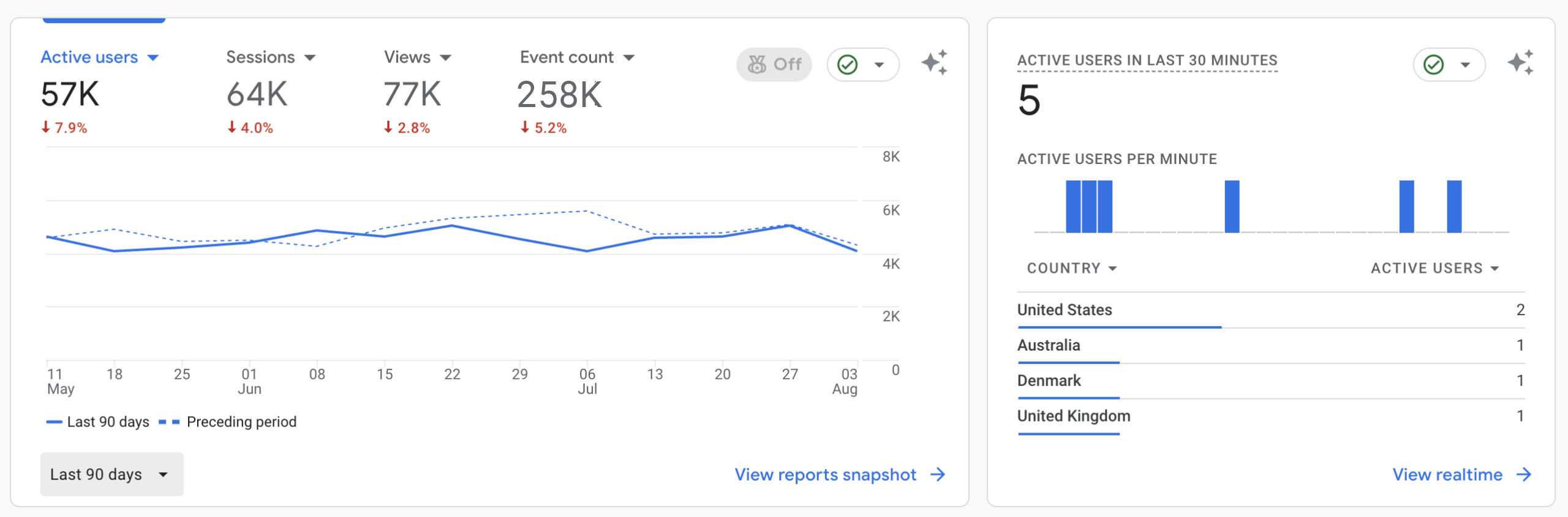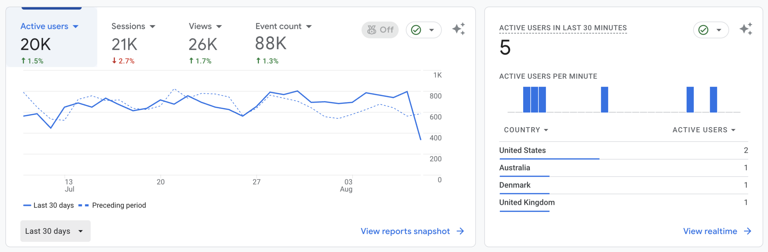 Sessions decreased slightly, but traffic remained steady with slight growth in users and views. Five people from the United States, Denmark, Australia, and the United Kingdom were online in the last 30 minutes.