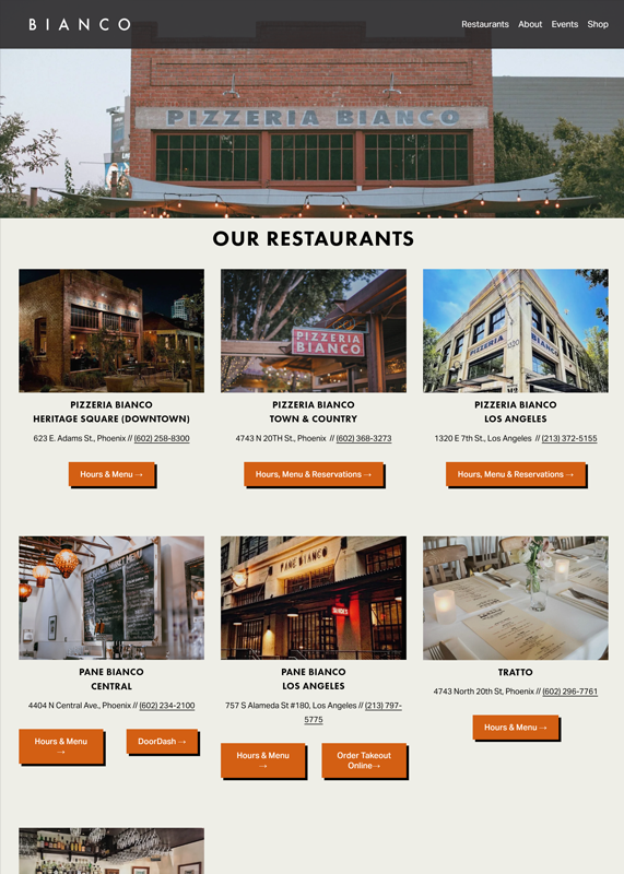 The desktop view looks modern, clean, and well-organized. High-quality images of each location make the site visually appealing and help users quickly identify different restaurants. The layout is intuitive, with clear call-to-action buttons for hours, menus, and reservations, making navigation simple and user-friendly.