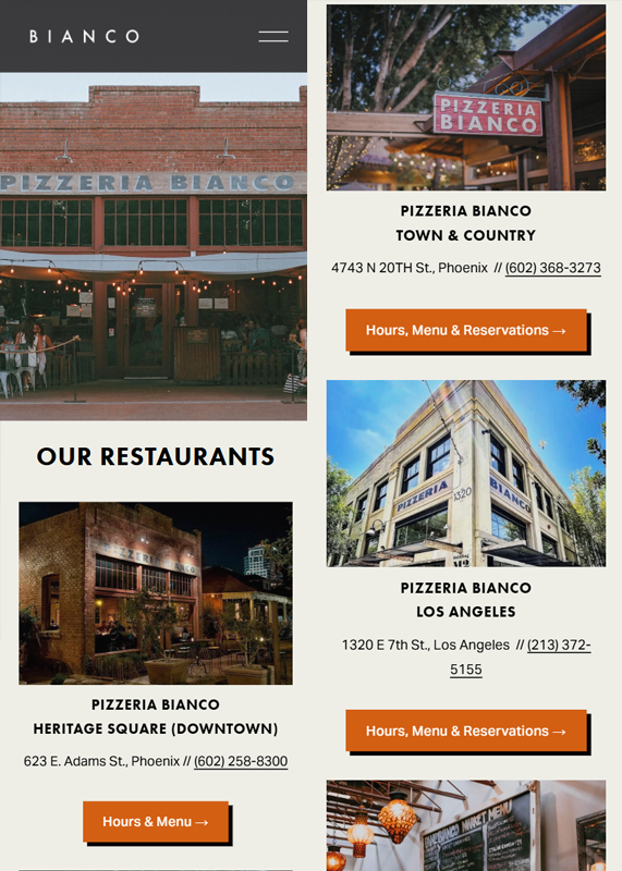 The mobile view is modern, clean, and very user-friendly. High-quality images and bold headings make it easy for users to recognize each location at a glance. Clear call-to-action buttons for menus and reservations stand out well, ensuring smooth navigation and an overall polished browsing experience.
