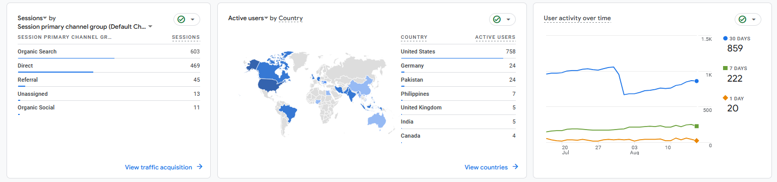 Top Channel: Organic Search (605 sessions) and Direct (471 sessions) were the most popular traffic sources. Organic Social, Unassigned, and Referral all played minor roles.