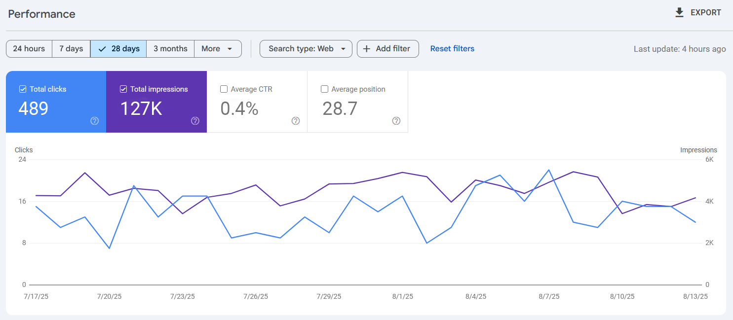 In the last 28 days, the website had 127K impressions and 489 clicks, with a CTR of 0.4%. The average position was 28.7, indicating moderate rankings. Traffic fluctuated, showing peaks and dips in impressions and clicks, suggesting that while SEO optimization is effective, further improvements are needed to increase CTR and maintain consistent growth.