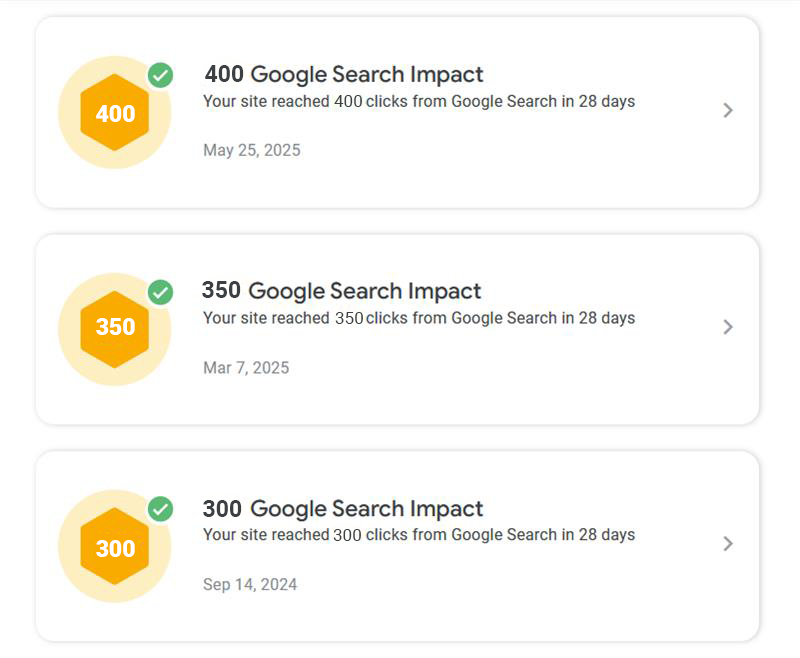 The website has experienced steady growth in Google Search Impact, reaching 300 clicks in September 2024, followed by 350 clicks in March 2025, and recently achieving 400 clicks in May 2025. This consistent increase in clicks shows that the SEO efforts are paying off, resulting in higher visibility and engagement through organic search. The progress indicates a positive trajectory toward achieving even greater search impact in the future.