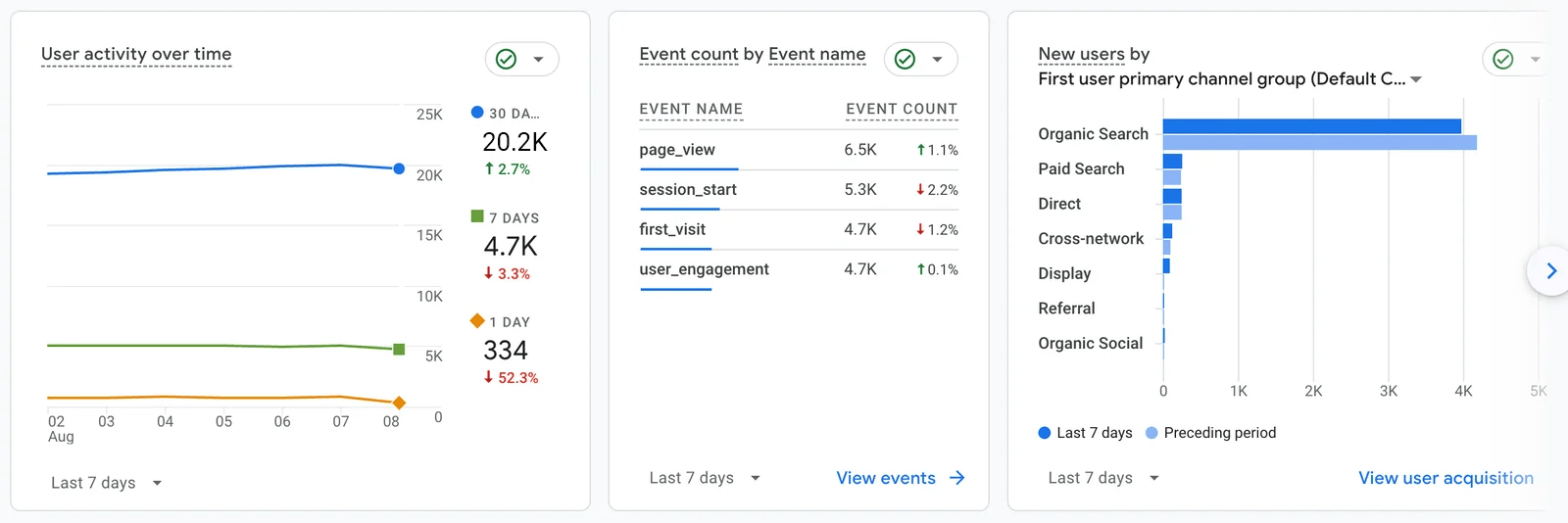 Over the last 7 days, the website had 20.2K total user activities, with 4.7K active users. Most new users came from organic search, followed by paid search and direct traffic. User engagement remained strong, with a 1.1% increase in page views and a steady number of sessions. The site’s performance continues to show consistent traffic, with a slight increase in overall user activity compared to the preceding period.