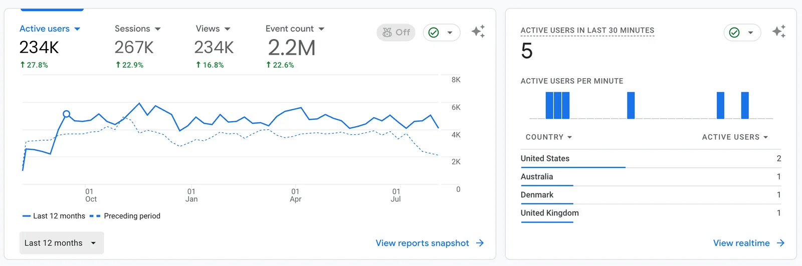 Over the last 90 days, the website saw 234K active users, with 267K sessions and 234K views, reflecting a 27.8% increase in activity compared to the previous period. The total event count reached 2.2M, indicating strong user interaction. The website showed consistent growth, with notable traffic from the United States, Australia, Denmark, and the United Kingdom. This steady performance highlights effective engagement and ongoing success, suggesting that SEO and marketing strategies are working well across multiple regions.