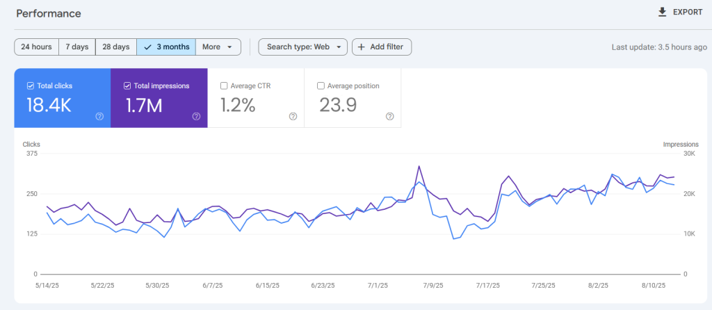 Over the past three months, the site achieved 18.4K total clicks from 1.7M impressions, with an average CTR of 1.2% and an average position of 23.9. Search visibility remained strong, with steady growth in impressions and multiple traffic spikes, showing progress in keyword reach and ranking performance.