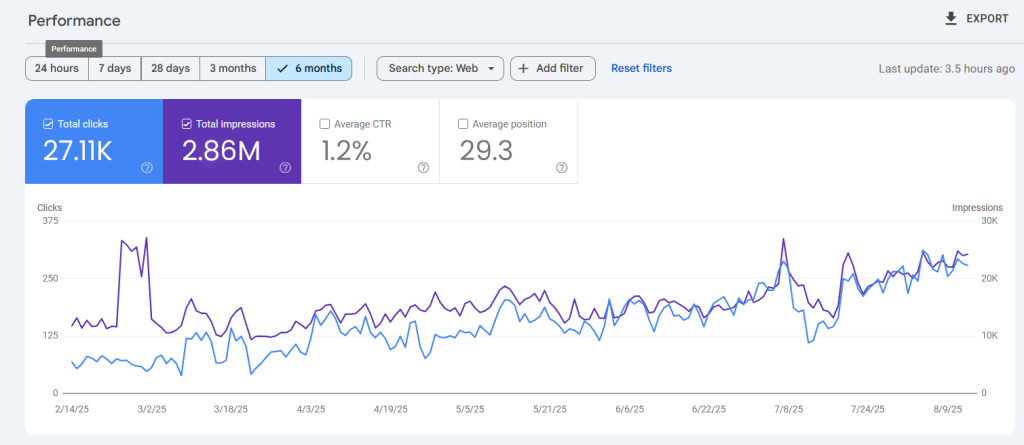Over the last six months, the website achieved 27.11K total clicks from 2.86M impressions, with an average CTR of 1.2% and an average position of 29.3. The data shows consistent growth in impressions and clicks, along with noticeable traffic spikes, reflecting improved keyword rankings and increased search visibility.
