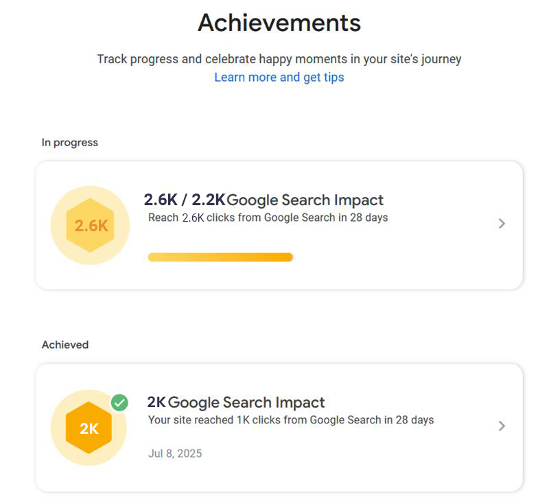 This website achievement highlights a steady uptick in Google Search Impact, with recent milestones of 921, 819, and 752 clicks over the last 28 days. The growing numbers indicate stronger visibility and engagement from search audiences. To keep the momentum, continue optimizing with targeted keywords, fresh content, and technical SEO tweaks.