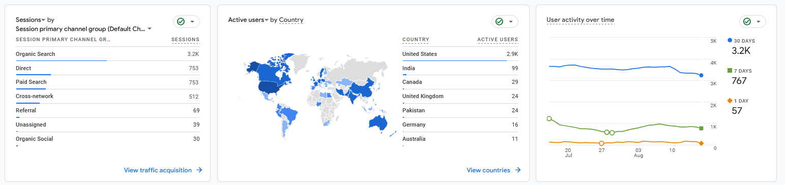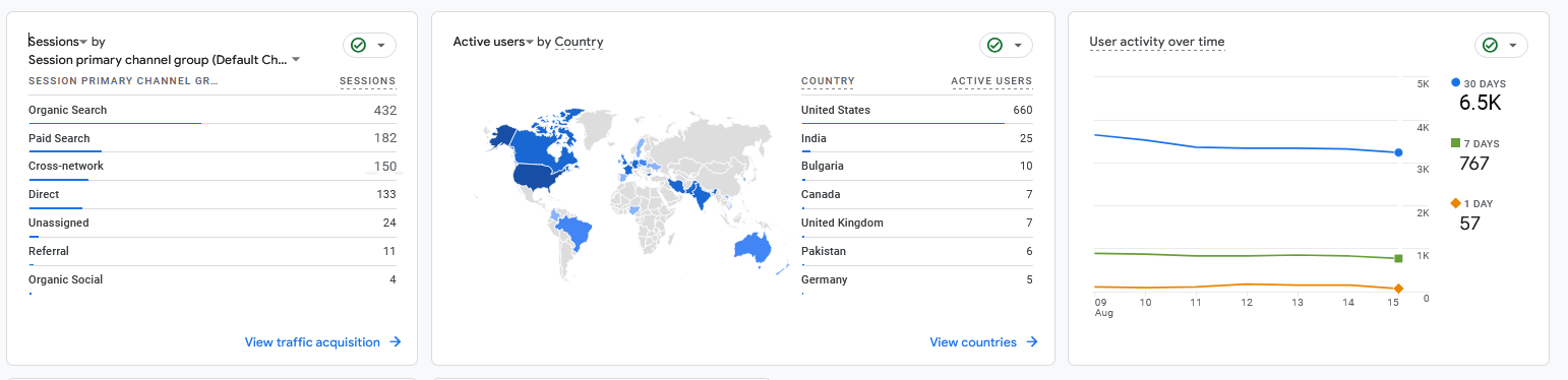 The 30-day performance summary shows steady engagement, with Organic Search leading overall traffic, followed by Paid Search and Cross-network. Most users come from the United States, with additional activity from other regions. Traffic remains stable with a slight upward trend, reflecting strong visibility and consistent interest across channels.