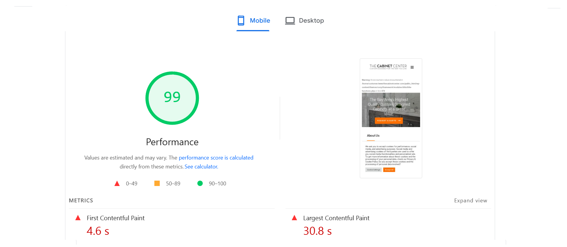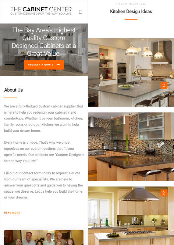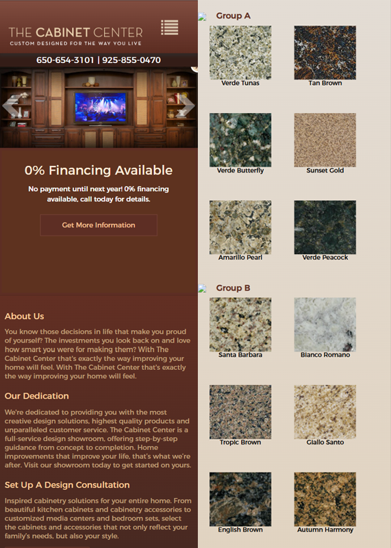 The mobile view feels cramped because the text sections and images are tightly packed with minimal breathing space. The split layout between content and stone samples appears unbalanced and makes navigation harder. The long text blocks reduce scannability, and the sample images seem too small, limiting visual clarity.