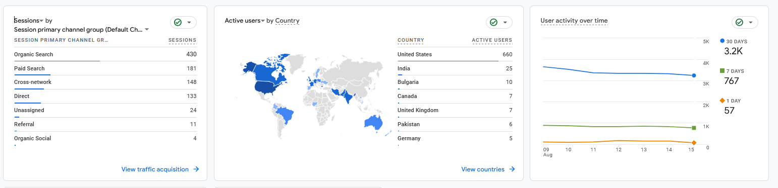 In the last 7 days, the website had 3.2K active users, with the United States contributing the most traffic (660 active users). Organic search led to 430 sessions, followed by paid search with 181 sessions and cross-network traffic generating 148 sessions. User activity has slightly decreased over the past 90 days but remains consistent within the last week, with 767 active users in the past 7 days.