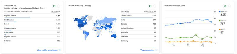 In the last 90 days, the website had 3.2K active users. Organic search generated 6.6K sessions, while paid search brought in 2.9K sessions. The majority of traffic came from the United States, followed by India, Canada, and the UK. User activity has steadily increased, with 767 active users in the past 7 days.