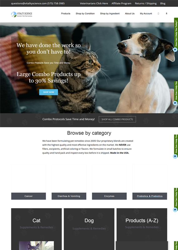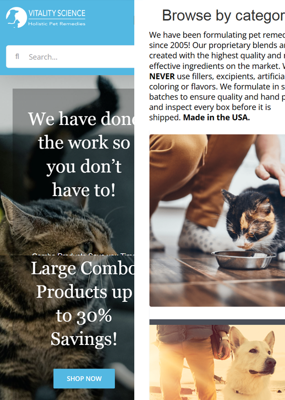 The Vitality Science website features a clean, professional design with clear call-to-action buttons and easy navigation. It highlights key product categories and emphasizes the use of high-quality ingredients, building trust with users. The pet-focused imagery and “Made in the USA” tag add to the site’s credibility. Additionally, the emphasis on combo products offers clear value, encouraging customers to save money and time.